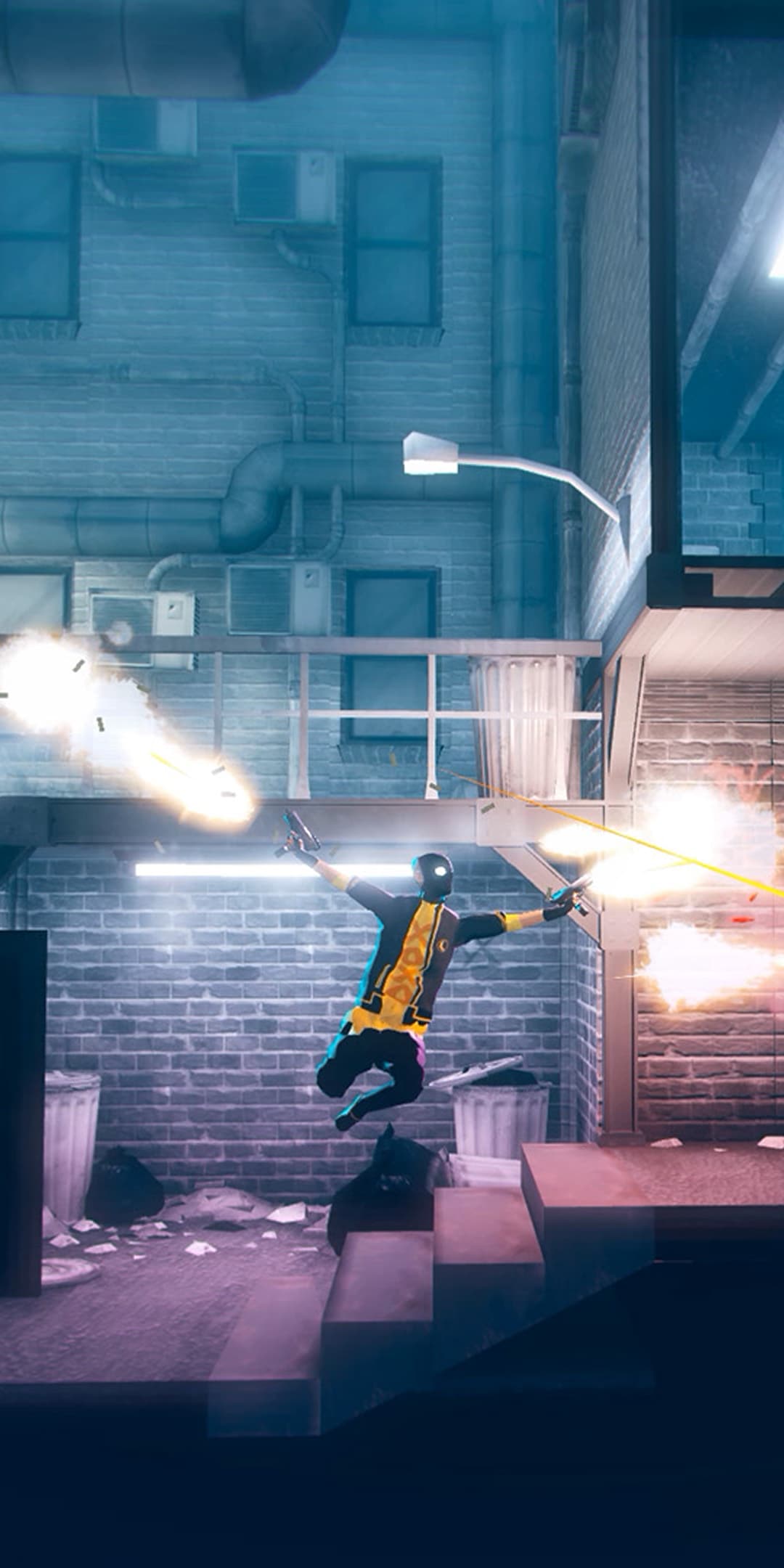 Full Throttle Gun Ballet: Unleash a torrent of destruction with an incredible level of control over both your weapons and your body. Twist and turn through the air while aiming both hands at priority threats or line up a perfect ricochet to drop an unsuspecting gangster from behind.